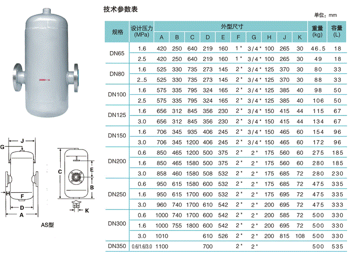 The AS type steam-water separator is suitable for steam, compressed air and other gas systems. It can remove moisture from steam, compressed air or gas systems and ensure the dryness of the steam used in the equipment.