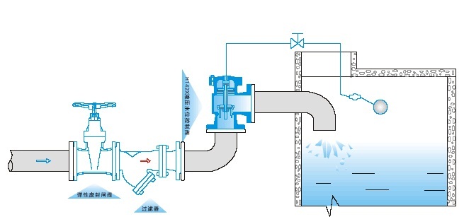 如此往复自动控制液面在设定高度,实现自动供水功能。该产品适用于工矿企业、民用建筑中各种水箱(池)、水塔的自动供水系统。并可用作常压锅炉循环供水控制阀。当水池或水塔内水位下降,浮球阀开启排水时,进水管内有压水将阀内活塞托起,密封面打开,阀门即开启供水,当水位上升到控制阀时,浮球阀关闭,活塞下移将密封面封闭,阀门即停止供水。